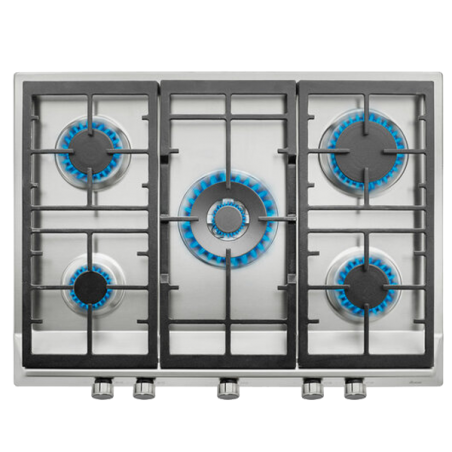 5 queimadores de gás (auxiliar 1,00 kW + 2 semirápidos 1,75 kW + rápido 2,80 kW + duplo anel 4,00 kW)