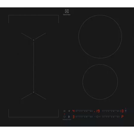 Funções: Indicador de calor residual em três passos, Alarme acústico, Aquecimento automático, Função PowerBoost, Segurança de crianças, Temporizador, Temporizador Eco, Controlo flexível, Função Hob2Hood, Bloqueio de painel, Função ponte, Aviso por minutos, Função Pausa, Desativar som, Temporizador